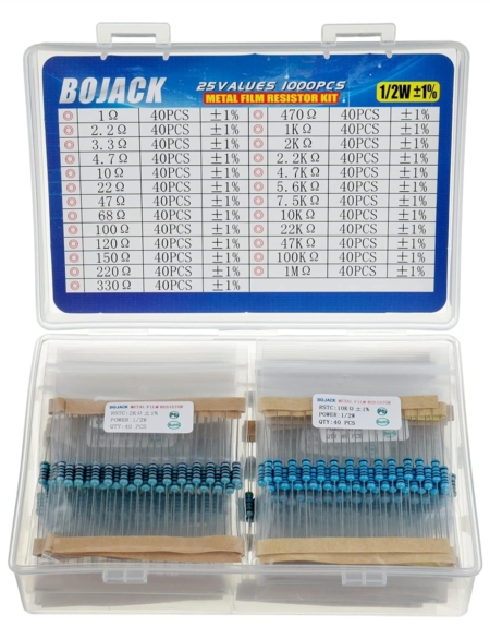 BOJACK resistor assortment kit contains 1000pcs resistors with variety values. Enough quantity for your DIY project and experiments